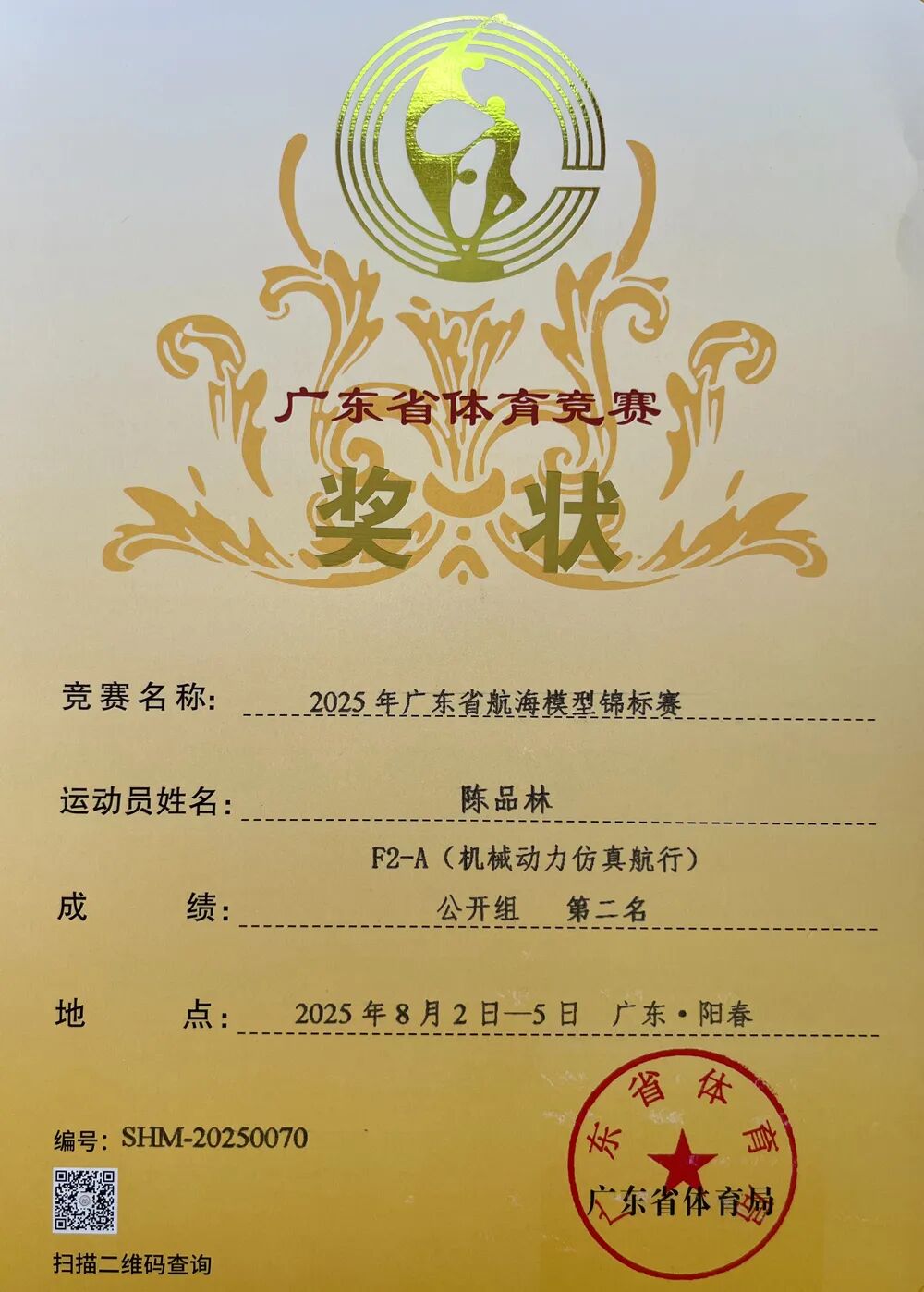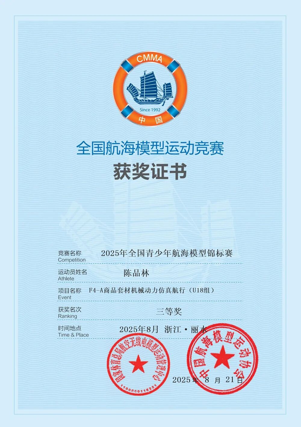 在2025年全国青少年航海模型锦标赛F4 - A商品套材机械动力仿真航行(U18组)项目中,陈品林同学一路披荆斩棘,最终荣获三等奖。这是对他在该项目上努力与实力的肯定,也为他的航海模型之路增添了一抹亮色。