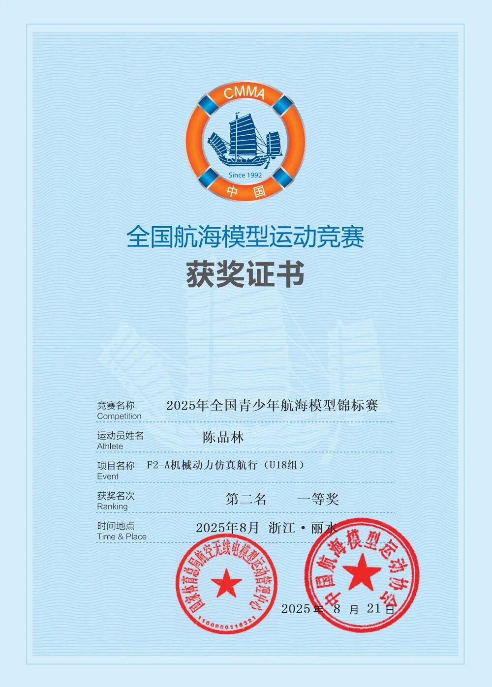 每一份荣誉的背后,都是陈品林同学对航海模型的热爱与付出。未来,期待他继续以梦为马,在航海模型的广阔天地中,驶向更辉煌的彼岸!