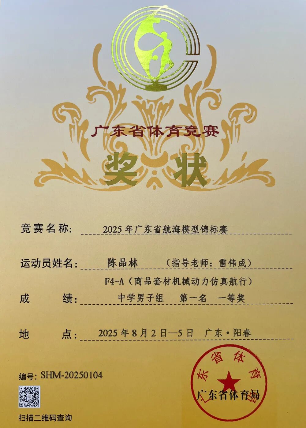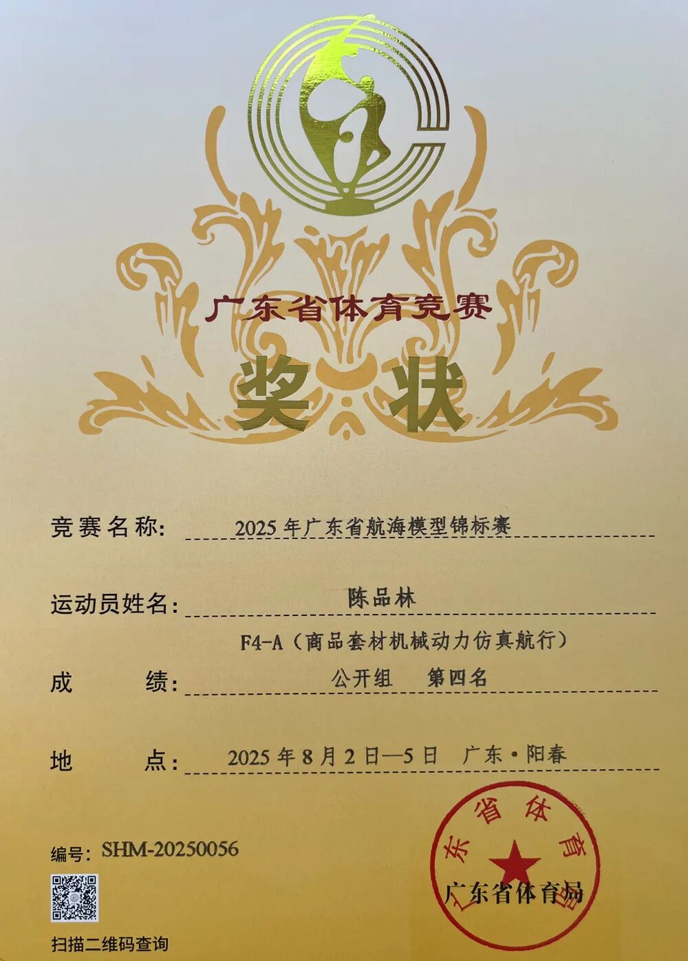 把目光转向广东省赛场,在2025年广东省航海模型锦标赛F4 - A(商品套材机械动力仿真航行)中学男子组比赛中,陈品林同学力压群雄,荣获第一名,拿下一等奖,尽显王者风范。