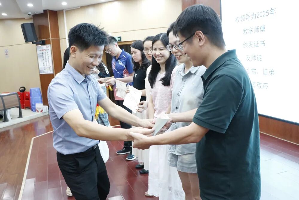 在全体教师的见证下,校党委副书记路仕容、副校长柯尊淦、副校长廖伟梁为指导师父们郑重颁发聘书。随后,结对徒弟依次向师父行拜师礼、敬感恩茶——一杯热茶,承载着青年教师的谦逊求知之心;深深一礼,传递着对前辈的敬重追随之志。仪式现场,师徒双方还互赠精心准备的纪念礼物,在温馨互动中搭建起传承与共进的桥梁。